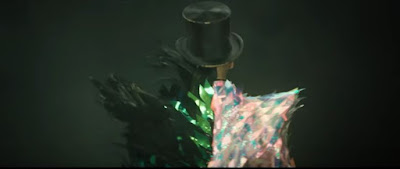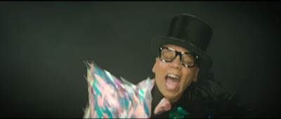 RuPaul/Mama Ru entra em cena aos 1:25 e logo percebemos que ele representa o Mágico de Oz por utilizar um terninho e um chapéu.