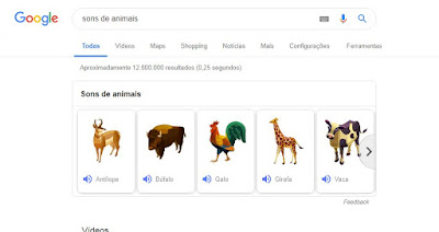 Sabia que ao digitar "sons de animais" no campo de pesquisa do Google é possível acessar sons de vários bichos, como antílope, galo, girafa, porco e zebra?! O intuito é educar crianças com imagens dos animais e seus respectivos sons.