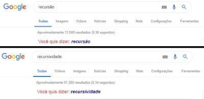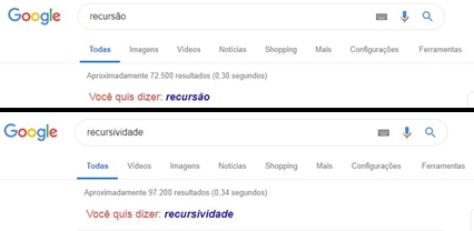 As palavras recursão e recursividade significam repetição. Ao realizar pesquisas com esses termos o Google, "acidentalmente", as repete ao aparecer as seguintes frases "você quis dizer: recursão" e "você quis dizer: recursividade".