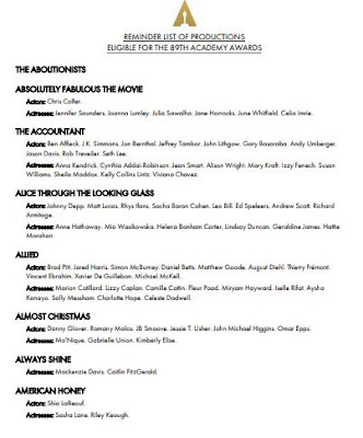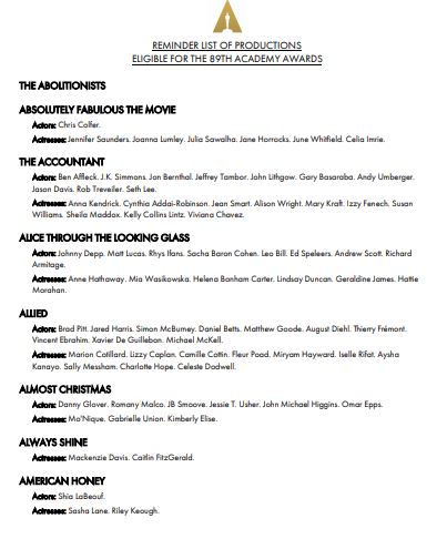 Primeira página da lista Reminder List of Eligible Releases da 89ª edição do Oscar©. I Oscar©