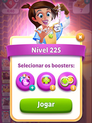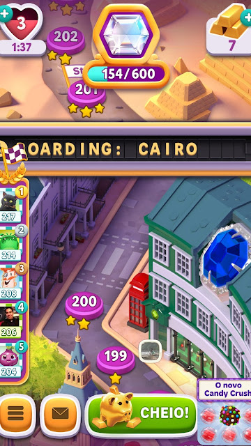 E o legal que quando você escolhe o destino de viagem, ainda ganha um booster disponível para aquela cidade, como: martelo, vidas que recarregam na metade do tempo, passarinhos ajudadores, trevo que elimina os charms da cor escolhida e booster que elimina os charms ao redor.
