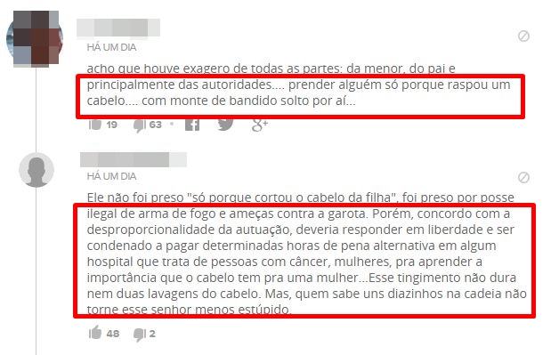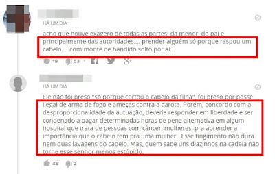 Esse é o meu ponto de vista sobre o fato, mas a Jeice Cruz também disse que "houveram muitos comentários machistas, mas também muitos feministas" na notícia reportada. Pude constatar isso bem. Leitores que foram a favor do pai; outros da menina. Alguns dos depoimentos foram extremistas, com alto teor de julgamento e falta de compaixão. Já outros, compassivos.